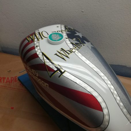 Como lo hacemos pues utilizando todas las tecnicas que conocemos y tenemos a nuestro alcance, como aerografía, fileteado, dorado con pan de oro y plata, sparkles, vinilos, etc.